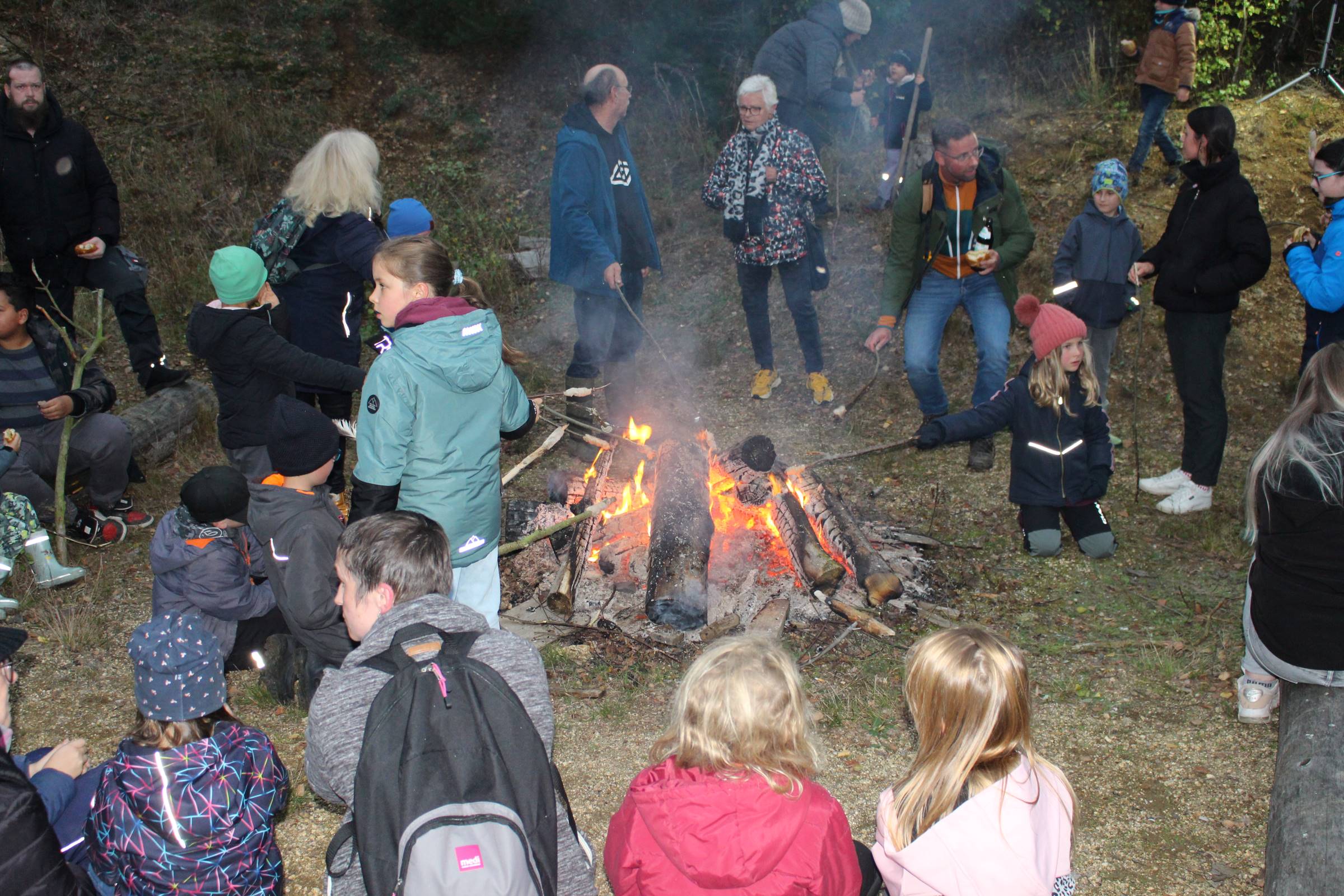 Zahlreiche kleine und große Gespensterexperten versammeln sich am Lagerfeuer vor der Geisterwanderung.