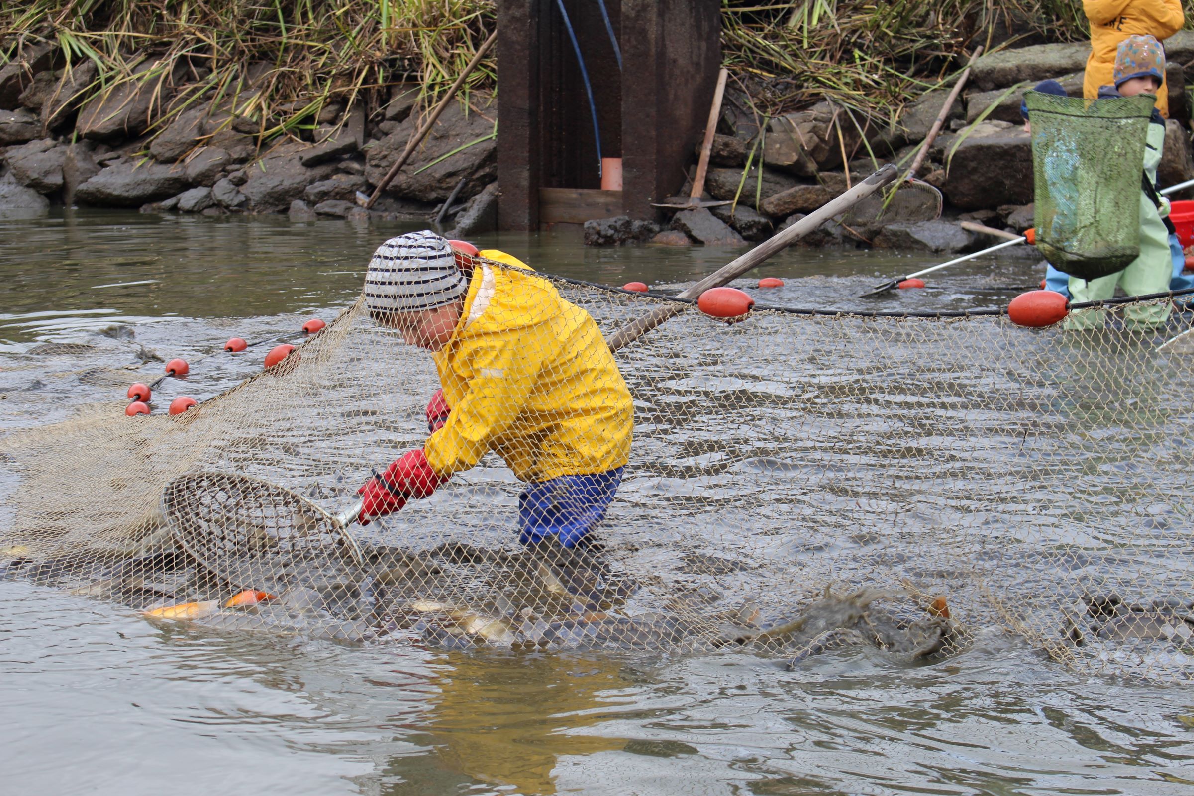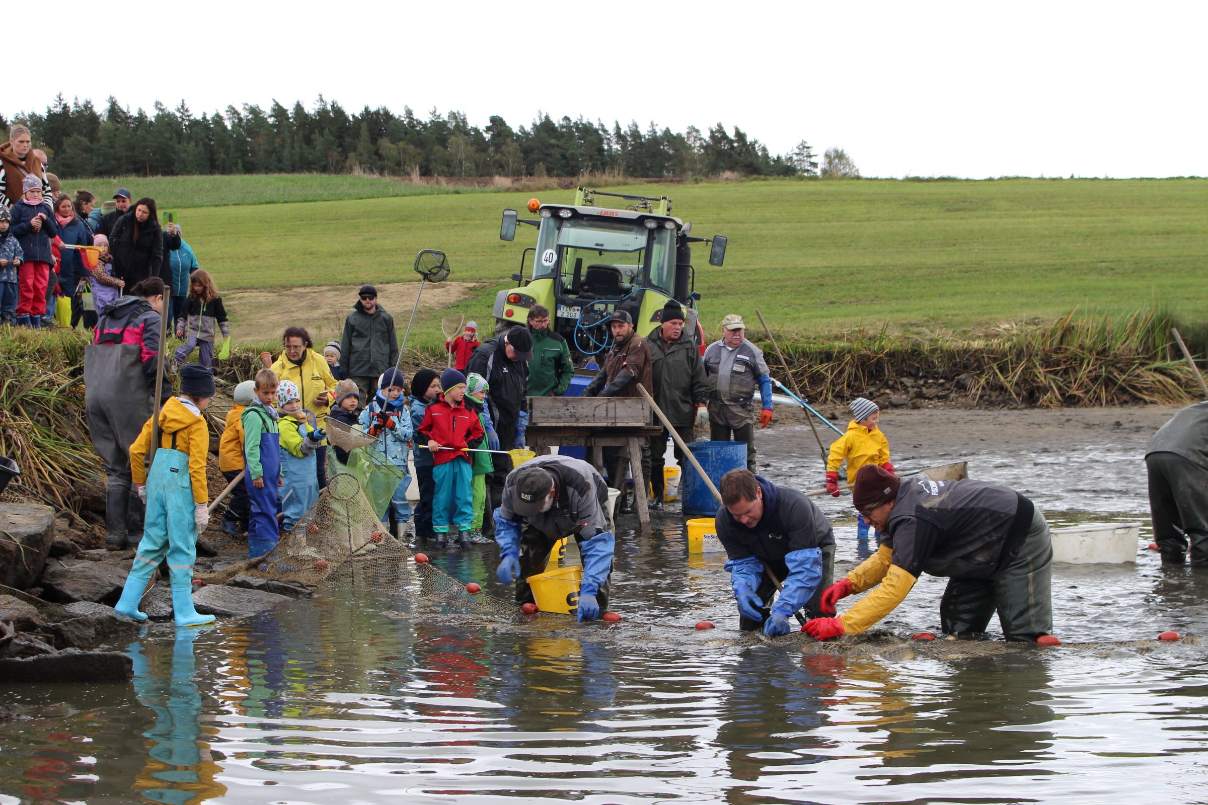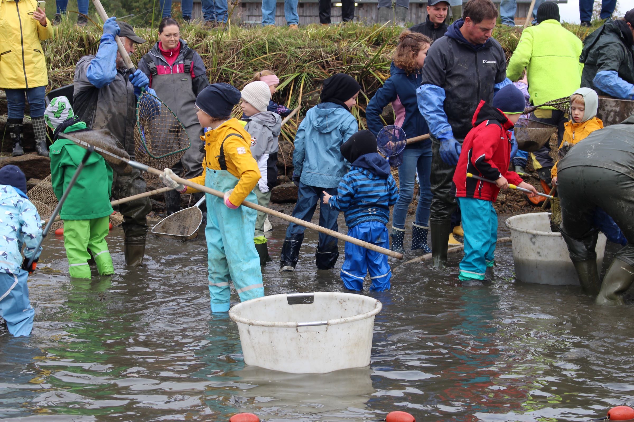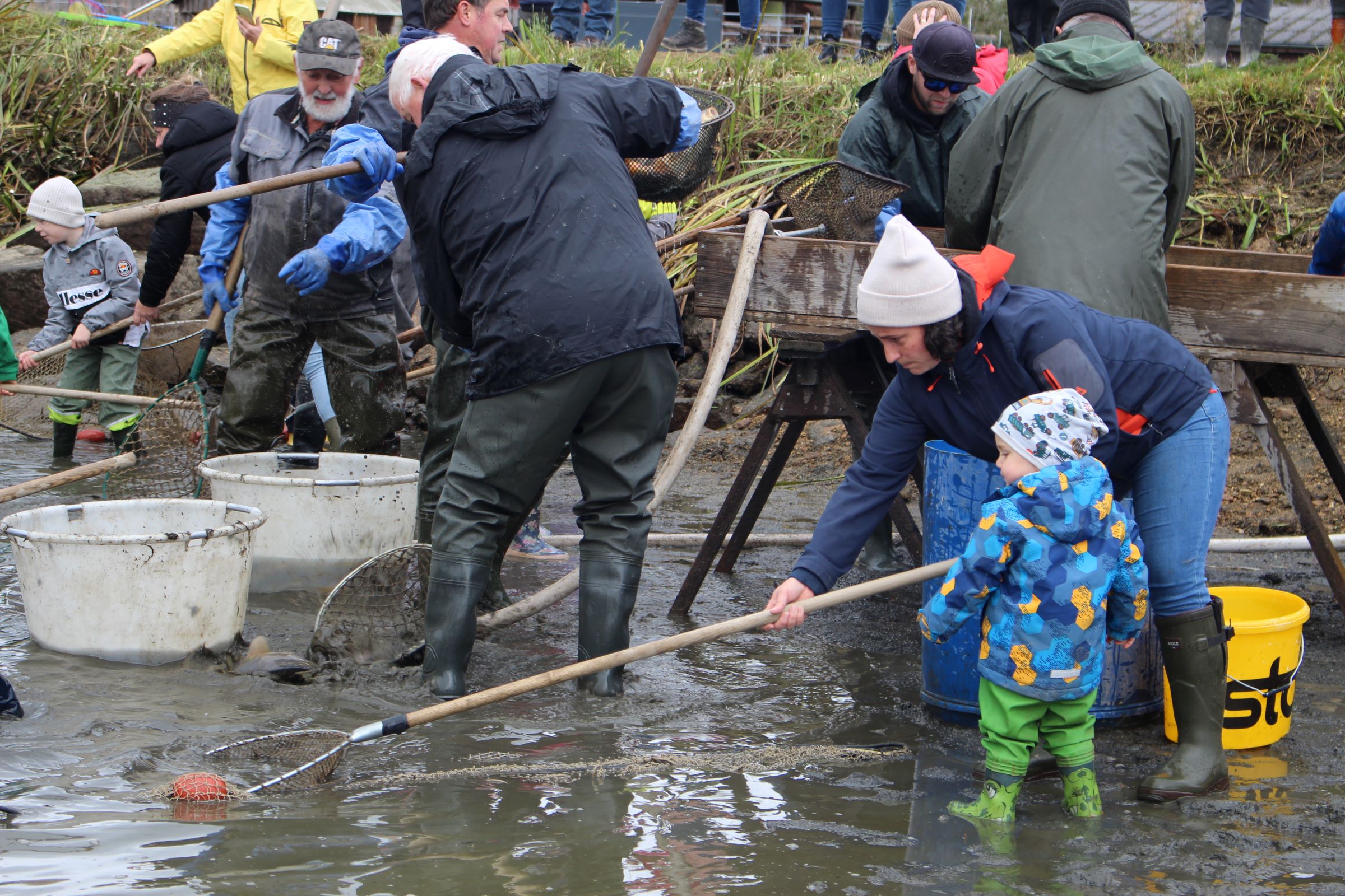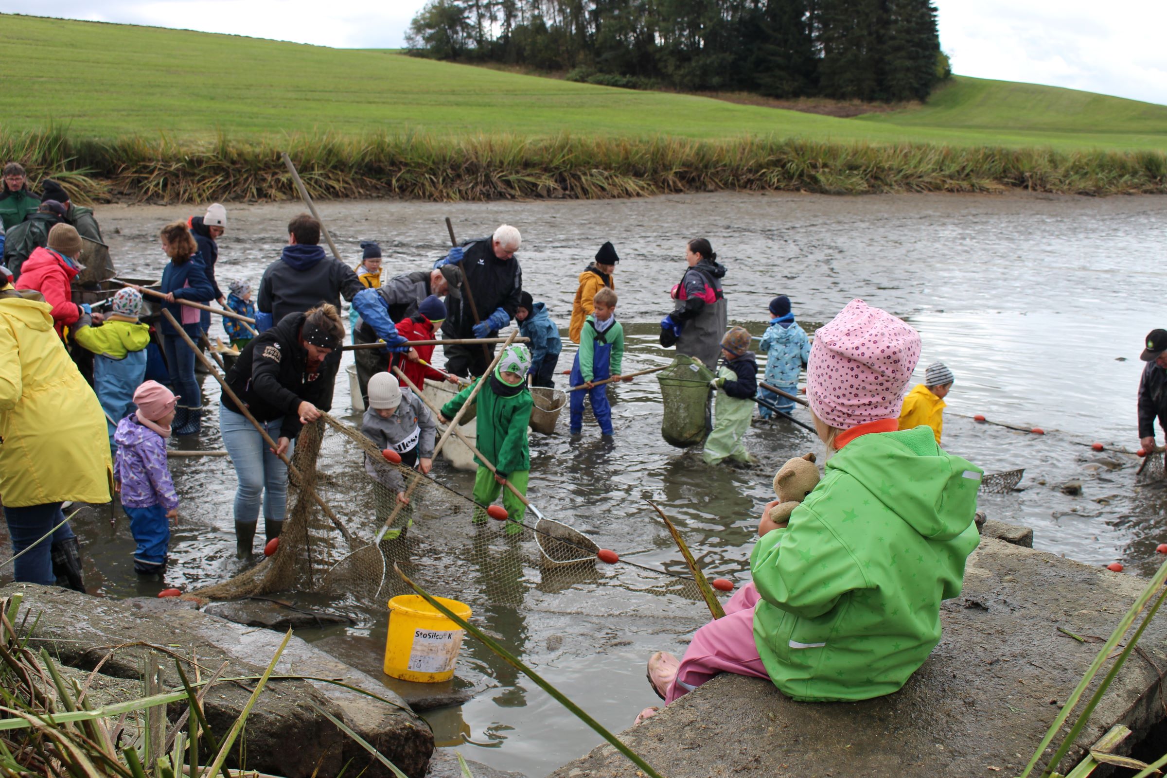 Zu Beginn beobachteten die Kinder aufmerksam, wie das Wasser aus dem Teich ablief. Langeweile kam deswegen trotzdem keine auf – denn schließlich gab es schon viel zu sehen, während die erwachsenen Helfer die ersten Netze spannten und alles fürs gemeinsame Abfischen vorbereiteten. Unter den aufmerksamen Augen der erfahrenen Fischer ging es dann auch schon bald für den Nachwuchs an die Arbeit – mit Keschern wurden Karpfen & Co. in die bereitstehenden Wannen befördert, am Sortiertisch nach Größe und Fischart sortiert und anschließend in ihr Winterquartier übergesiedelt.